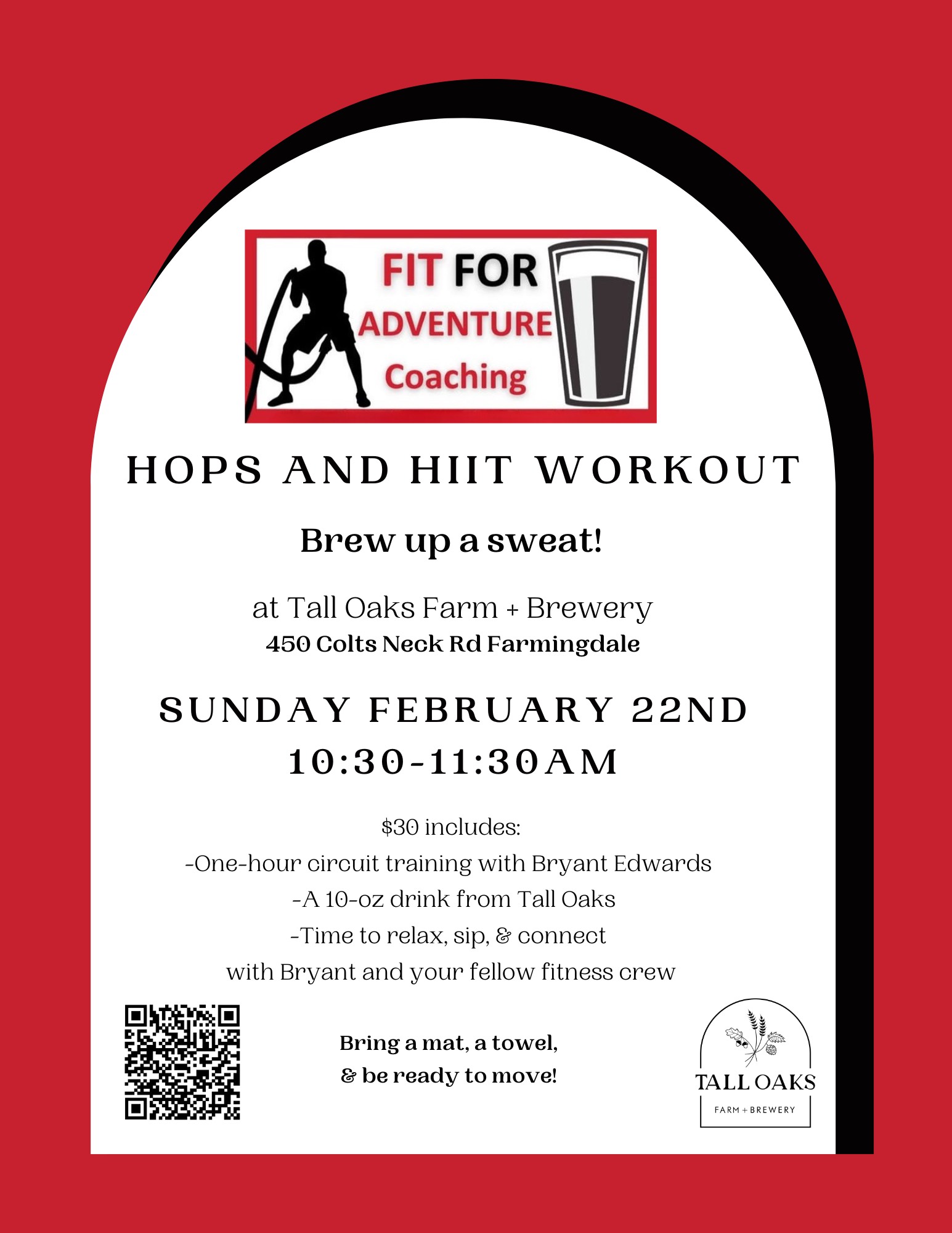 Hops & HIIT Workout at Tall Oaks UPDATE: Due to tomorrow’s weather predictions, this class has been moved to Saturday February 28th – thank you. Click here to secure your spot today! + Add to Google Calendar + iCal / Outlook export The event is finished. Date Feb 28 2026 Expired! Time 10:30 am - 11:30 am Category Event