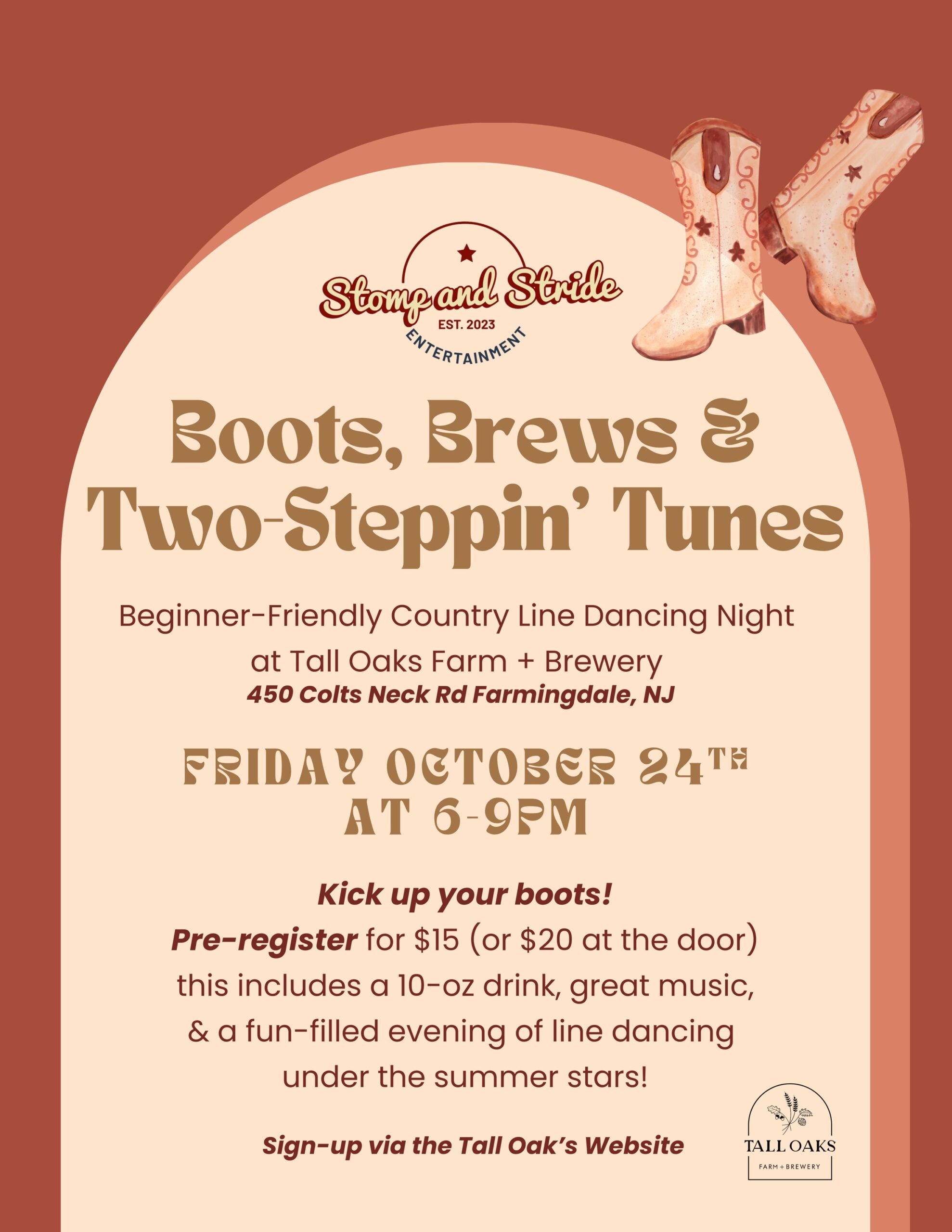 Country line dancing is back yet again at Tall Oaks Farm + Brewery and we want to see YOU there! Grab some friends, co-workers, family, or just bring yourself for a fun evening of dancing, craft brews, and delicious eats from Rosa’s Kitchen.