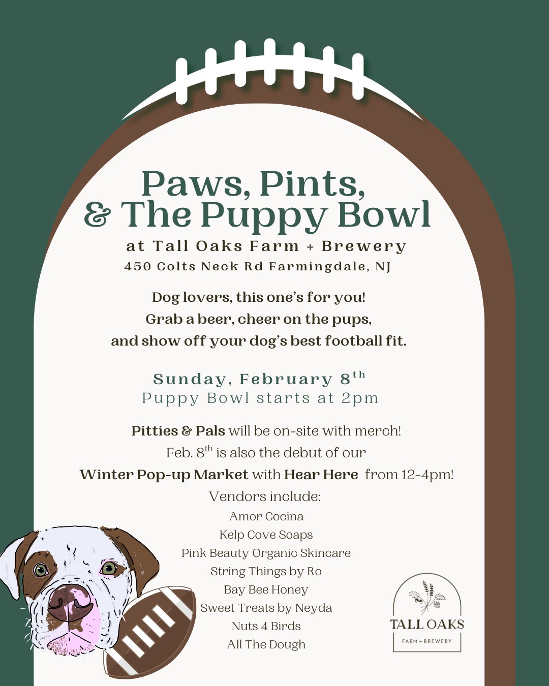 Tall Oaks Winter Pop-up Market and Puppy Bowl Fun! Whether you’re bringing a dog or just yourself, Tall Oaks is the place to be. A laid-back, fun chance to hang, sip, shop, enjoy some good company and pregame before the Super Bowl! + Add to Google Calendar + iCal / Outlook export 00 days 00 hours 00 minutes 00 seconds Date Feb 08 2026 Time 12:00 pm - 4:00 pm Category Event