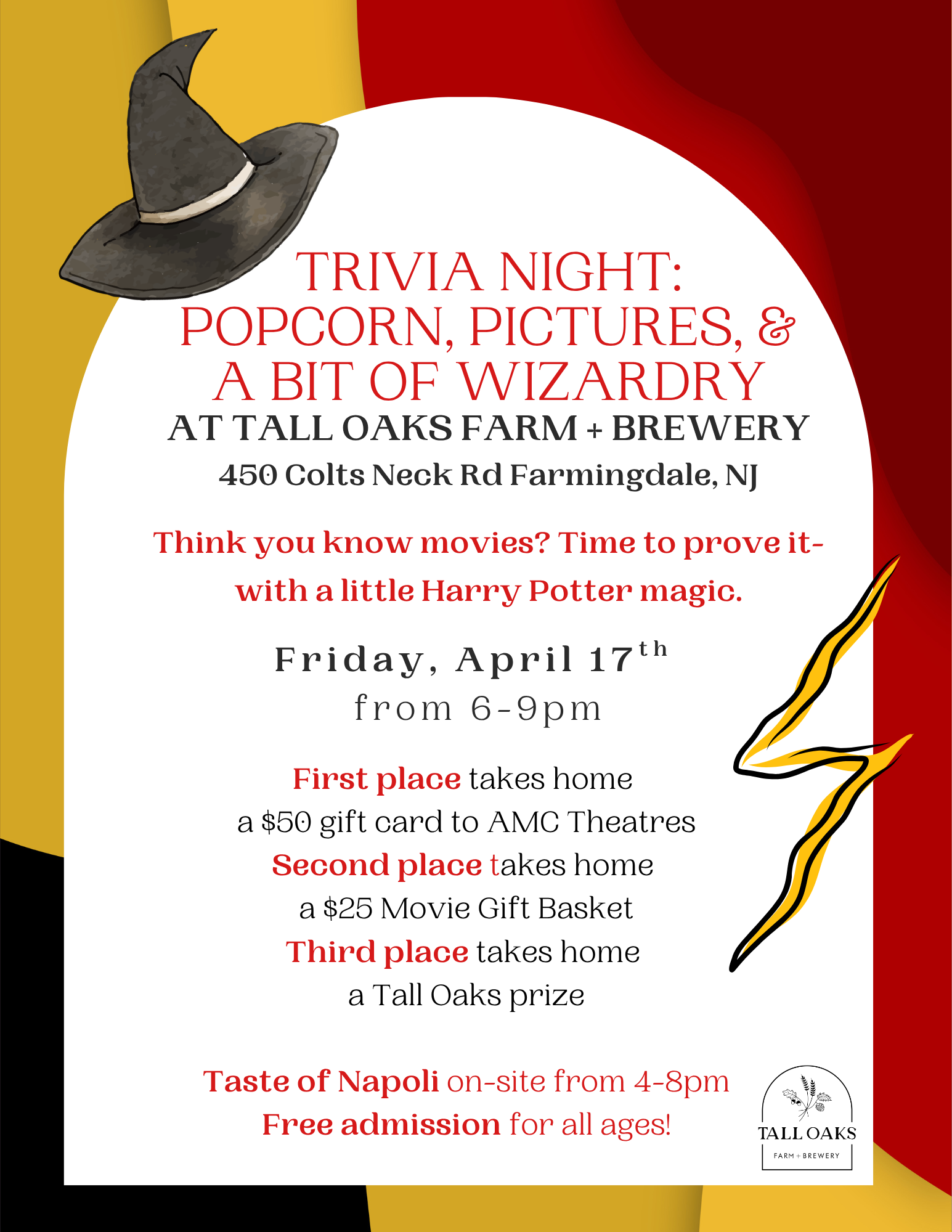 Trivia Night: Popcorn, Pictures & a Bit of Wizardry We’re back outside in the beautiful Pavilion for trivia nights! + Add to Google Calendar + iCal / Outlook export 00 days 00 hours 00 minutes 00 seconds Date Apr 17 2026 Time 6:00 pm - 9:00 pm Category Event